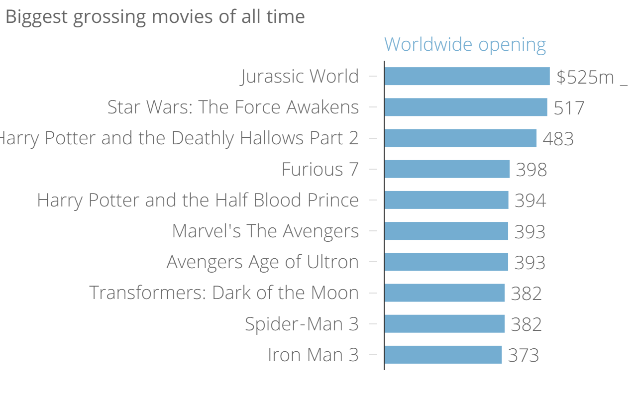 The hugely anticipated seventh Star Wars film, The Force Awakens, raked in $517m (£347m) across the globe, and grossed a record $238m in the US and Canada alone, making it the biggest ever opening weekend in history ahead of dinosaur blockbuster Jurassic Word, which raked in $208.8m earlier this year.