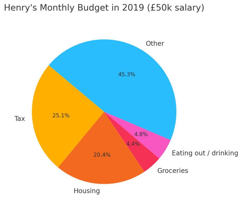 Then there’s tax. Henry now pays £2,868 per month, nearly three times what he paid when his salary was £50k. In total, £34,420.60 of his annual salary goes on tax. So, in terms of disposable income, between 2019-2025, despite the £50k increase, Henry only sees an increase of £6k of real disposable annual income (adjusted for inflation).