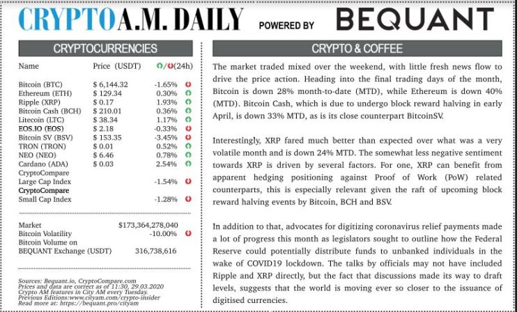 Monday 30 March 2020 10:21 am | Updated: Friday 05 November 2021 5:12 pm Crypto Daily – March 30, 2020 By: Crypto AM Daily in association with BEQUANT Share Facebook Share on Facebook X Share on Twitter LinkedIn Share on LinkedIn WhatsApp Share on WhatsApp Email Share on Email Download PDF News Updates Stay ahead with our three daily briefings delivering all the key market moves, top business and political stories, and incisive analysis straight to your inbox.