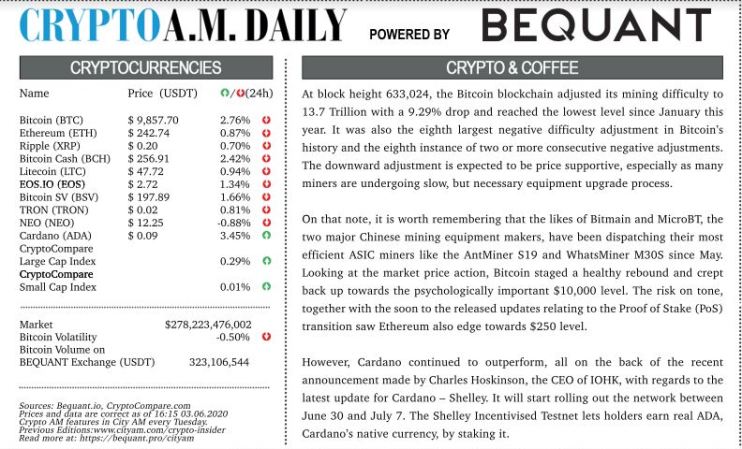 Friday 05 June 2020 9:01 am | Updated: Friday 05 November 2021 4:39 pm Crypto Daily – June 5, 2020 By: Crypto AM Daily in association with BEQUANT Share Facebook Share on Facebook X Share on Twitter LinkedIn Share on LinkedIn WhatsApp Share on WhatsApp Email Share on Email Download PDF News Updates Stay ahead with our three daily briefings delivering all the key market moves, top business and political stories, and incisive analysis straight to your inbox.