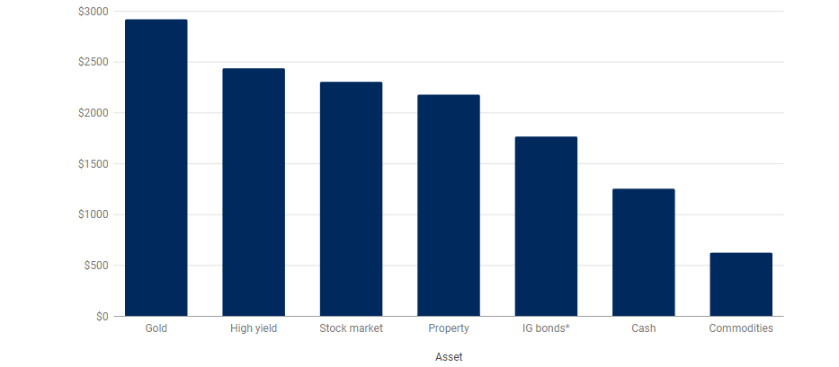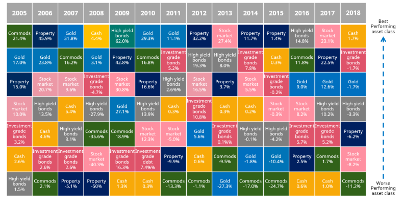 Past performance is not a guide to future performance and may not be repeated. Source: Schroders, Refinitiv data correct as of 01 January 2019. Stock Market: MSCI World Total Return Index, Property: Thomson Reuters Developed Market Real Estate Total Return Index. Cash: IBA US dollar interbank LIBOR 3 month, High Yield Bonds: BofA Merrill Lynch Global High Yield TR Index, Investment Grade Bonds: ICE BofAML Global Corporate Total Return Index, Commods: Bloomberg Commodity Index, Gold: Gold Bullion LBM $/t oz. All show total return in local currency.