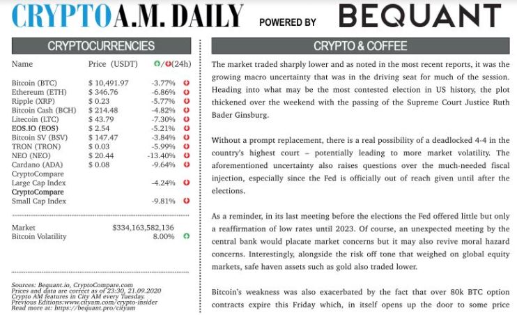 Tuesday 22 September 2020 10:13 am | Updated: Friday 05 November 2021 4:03 pm Crypto Daily – September 22, 2020 By: Crypto AM Daily in association with BEQUANT Share Facebook Share on Facebook X Share on Twitter LinkedIn Share on LinkedIn WhatsApp Share on WhatsApp Email Share on Email Download PDF News Updates Stay ahead with our three daily briefings delivering all the key market moves, top business and political stories, and incisive analysis straight to your inbox.