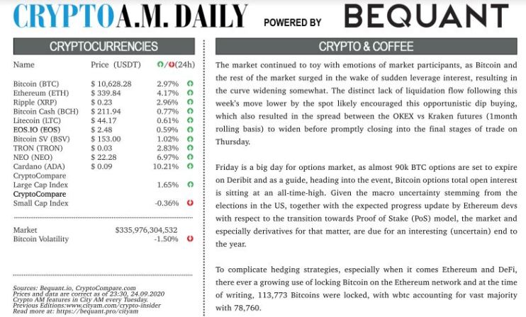 Friday 25 September 2020 11:21 am | Updated: Friday 05 November 2021 4:01 pm Crypto Daily – September 25, 2020 By: Crypto AM Daily in association with BEQUANT Share Facebook Share on Facebook X Share on Twitter LinkedIn Share on LinkedIn WhatsApp Share on WhatsApp Email Share on Email Download PDF News Updates Stay ahead with our three daily briefings delivering all the key market moves, top business and political stories, and incisive analysis straight to your inbox.