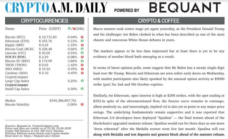 Wednesday 30 September 2020 10:33 am | Updated: Monday 27 September 2021 5:24 pm Crypto Daily – September 30, 2020 By: Bridie Wilson Share Facebook Share on Facebook X Share on Twitter LinkedIn Share on LinkedIn WhatsApp Share on WhatsApp Email Share on Email Download PDF News Updates Stay ahead with our three daily briefings delivering all the key market moves, top business and political stories, and incisive analysis straight to your inbox.