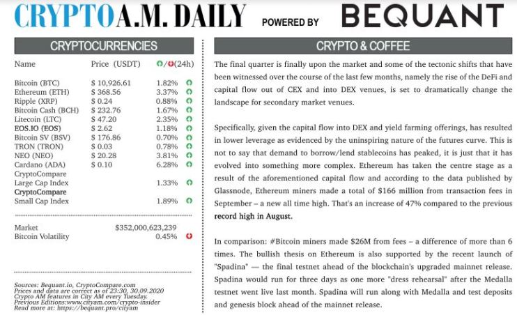 Thursday 01 October 2020 10:32 am | Updated: Monday 27 September 2021 5:24 pm Crypto Daily – October 1, 2020 By: Bridie Wilson Share Facebook Share on Facebook X Share on Twitter LinkedIn Share on LinkedIn WhatsApp Share on WhatsApp Email Share on Email Download PDF News Updates Stay ahead with our three daily briefings delivering all the key market moves, top business and political stories, and incisive analysis straight to your inbox.