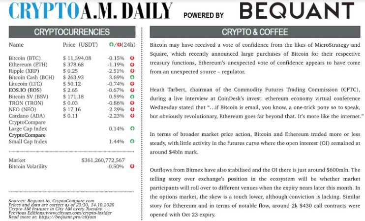 Thursday 15 October 2020 11:13 am | Updated: Friday 05 November 2021 3:55 pm Crypto Daily – October 15, 2020 By: Crypto AM Daily in association with BEQUANT Share Facebook Share on Facebook X Share on Twitter LinkedIn Share on LinkedIn WhatsApp Share on WhatsApp Email Share on Email Download PDF News Updates Stay ahead with our three daily briefings delivering all the key market moves, top business and political stories, and incisive analysis straight to your inbox.