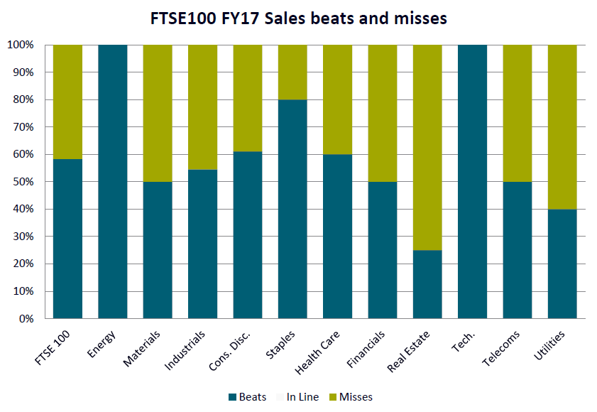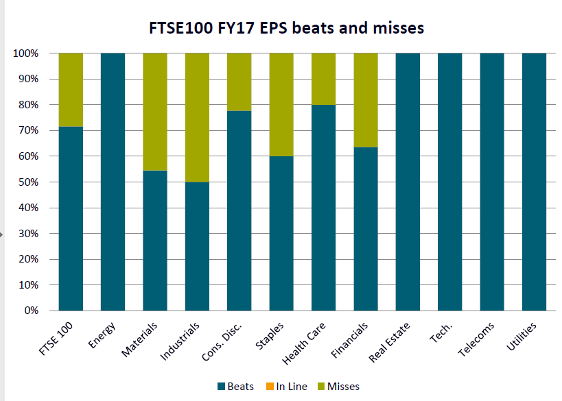 • With more than 80 per cent of FTSE 100 stocks having reported, the UK earnings season is now coming to a close. Earnings results show 2017 was a good year for FTSE 100 stocks as all sectors saw positive earnings growth although Cyclicals, led by Energy, did better than Defensive sectors.