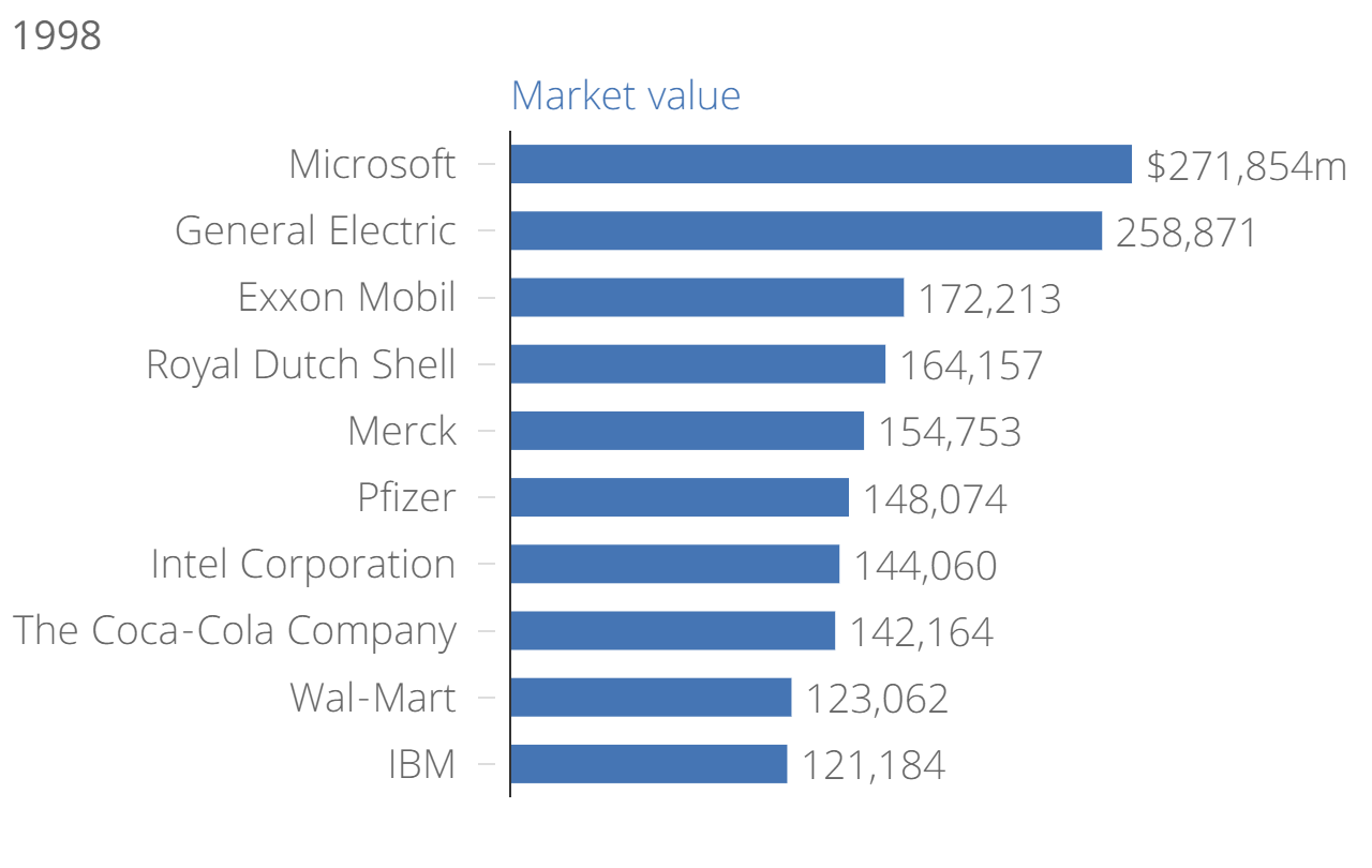 Almost two decades ago, when Google first started out, the top 10 list of the biggest companies in the world looked like this.