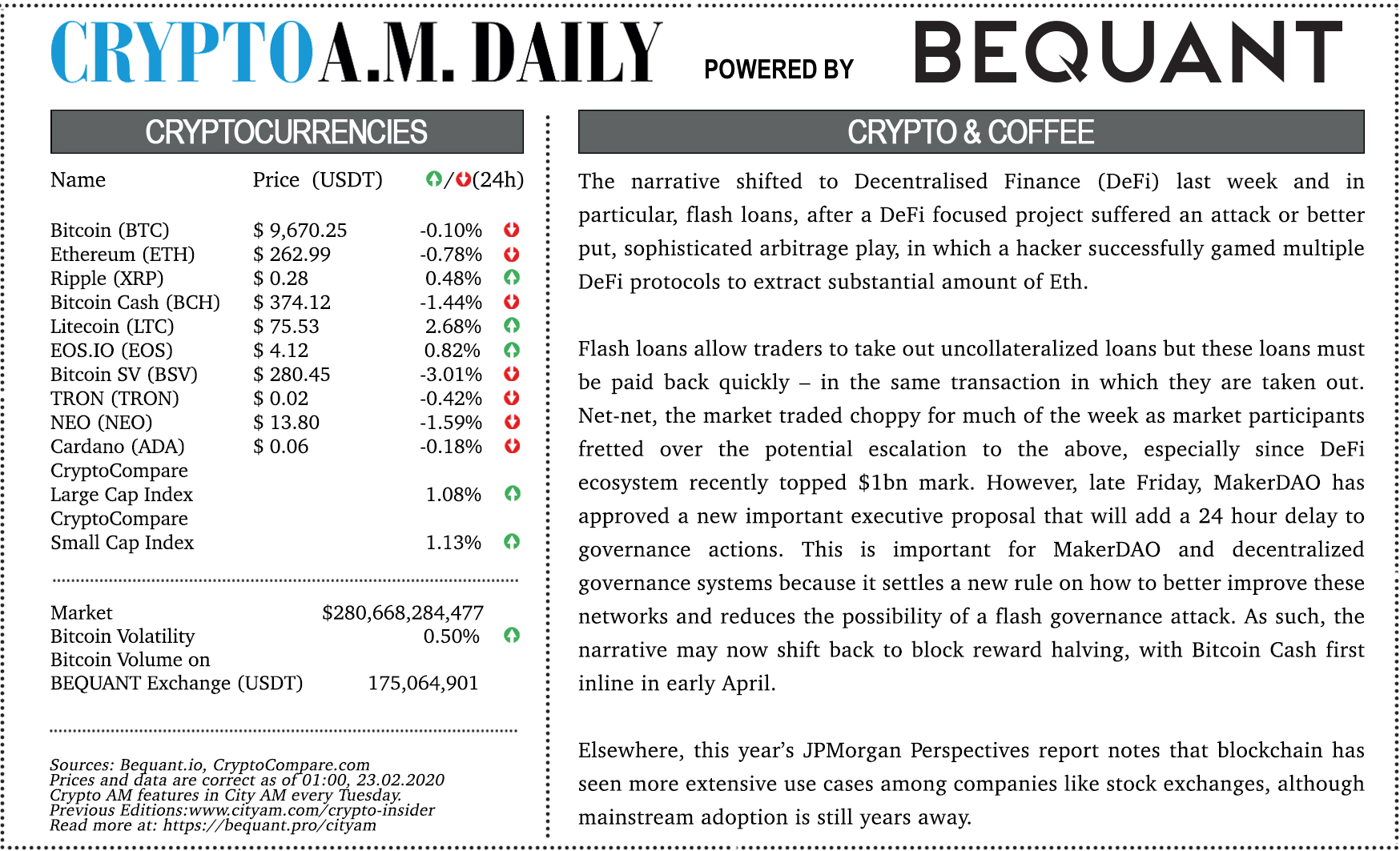Monday 24 February 2020 2:05 pm | Updated: Monday 08 November 2021 1:18 pm Crypto Daily – February 24, 2020 By: City AM reporter Share Facebook Share on Facebook X Share on Twitter LinkedIn Share on LinkedIn WhatsApp Share on WhatsApp Email Share on Email Download PDF News Updates Stay ahead with our three daily briefings delivering all the key market moves, top business and political stories, and incisive analysis straight to your inbox.