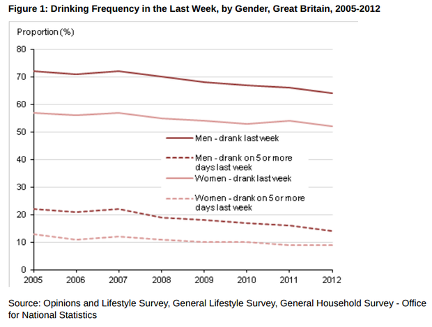 2. Drinking levels dropped in Britain during recession. Between 2005 and 2012 the proportion of men who drank alcohol in the week before being interviewed fell from 72 per cent to 64 per cent, and the proportion of women went down from 57 per cent to 52 per cent.