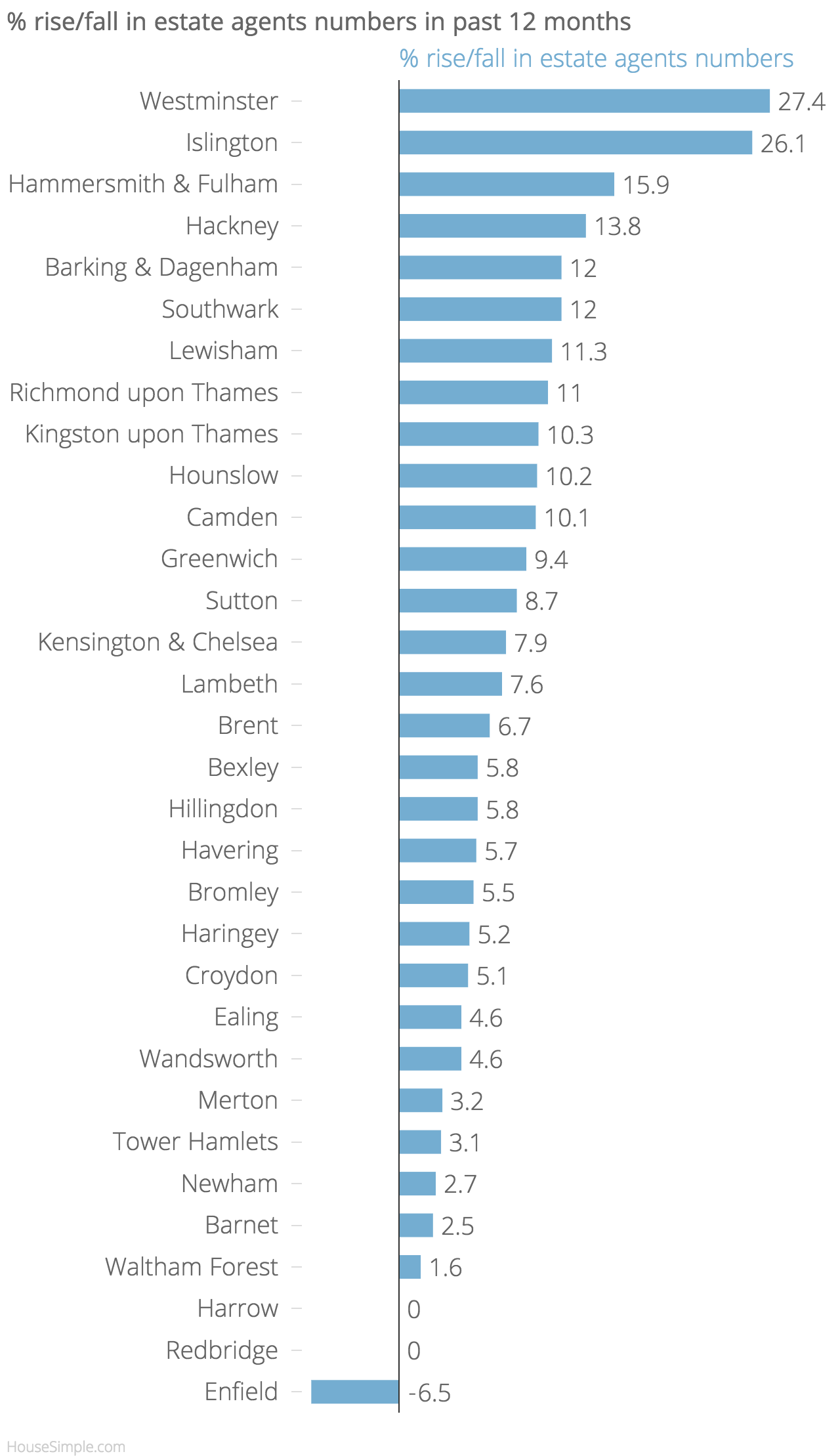 The study by online estate agents HouseSimple.com discovered that greater London now has almost 2,900 estate agents lining its high streets, which equates to an average of 90 in each of the 32 boroughs.