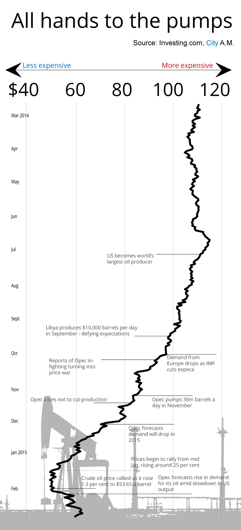 The decline in the global oil price has been a painful affair for some and the cause of celebration for others. Profits at companies such as BP have fallen, while inflation in the UK has dropped to 0.3 per cent, giving a handy boost to both real wages and the Conservative party, which envisages a tough electoral campaign, with a few pitched battles centred around the cost of living.