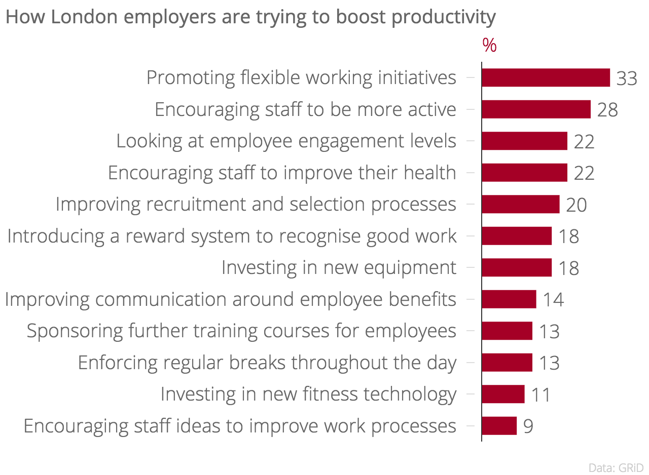 In a bid to up their staff’s productivity levels, 33 per cent of London employers are promoting flexible working initiatives, 28 per cent are encouraging their staff to be more active and 22 per cent are taking a closer look at employee engagement statistics.