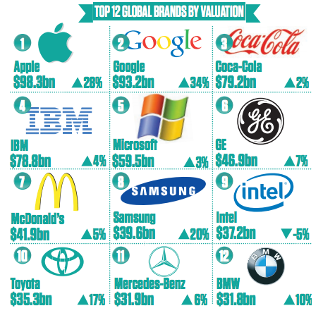 Computer giant Apple had a brand valuation of $98.3bn in 2013, moving the company from the second spot in 2012 to the top of the list this year.