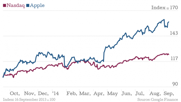 With iPhones roaring off the shelves, it would perhaps seem logical that Apple's share price would do the same after a launch. It is true that Apple has had a relatively strong year financially, and that it has out performed the Nasdaq, as this chart shows.