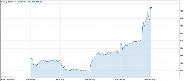 Apple’s share price just missed hitting $500 (£322) as the US markets opened today, reaching $499.93 – up 2.1 per cent from the previous close.