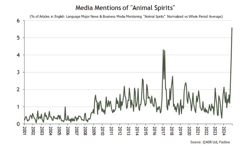 Research from Absolute Strategy Research found that media mentions of ‘animal spirits’ had spiked to an all-time high in recent weeks, which could evident that the price of stocks is becoming un-tethered from their actual value.