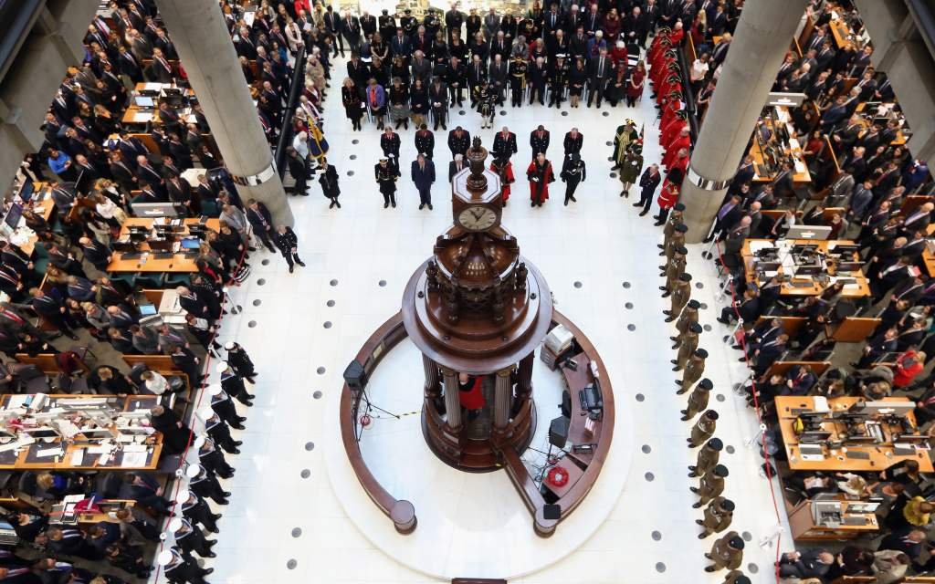 Workers also gathered in the Lloyds Building, where the service was observed with the ringing of the Lutine Bell, the laying of wreaths before the Book of Remembrance and a two minute silence.