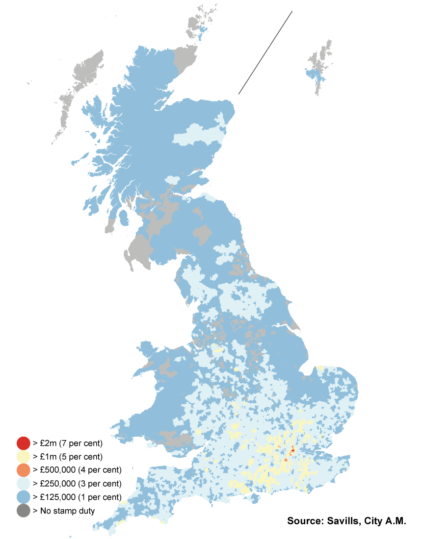 Data by upmarket estate agent Savills shows the average value of a house by ward. By mapping the average house price in each ward and colouring it by Stamp Duty Land Tax (SDLT) band, it becomes obvious why London is such a stamp duty gold mine.