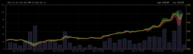 Crypto currency Bitcoin has breached the $600 barrier this morning, having passed $500 yesterday.