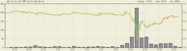 Bitcoin prices have risen to $680, having fallen below $540 earlier in the day.