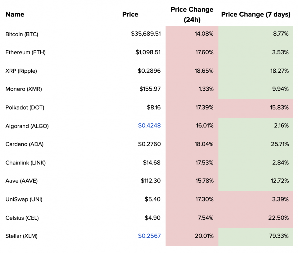 The leading cryptocurrency by market cap dropped more than $7,000 in a matter of hours – a fall that was echoed across the space, as many alt coins saw 15% or more knocked off their value. It was particularly disappointing for Ethereum, which had seen a huge rise earlier in the day to well over $1,200 and looked on course to set a new all-time high before the retrace.