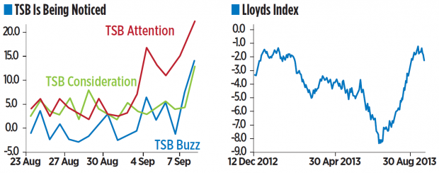 Given that TSB is a new bank, rather than focus on perceptions I’ve turned my thoughts to Attention and Buzz – are people talking about it, and is that talk positive?