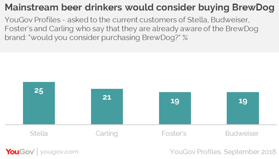 YouGov profiles data shows that there is certainly scope for this to be achieved, with current customers of some of the UK’s largest beer brands saying that they would consider purchasing it. Among the brands targeted in the ad campaign, 25 per cent of Stella’s current customers (who also say they are aware of the Brewdog brand) would consider it, followed by 21 per cent of Carling’s, 19 per cent of Budweiser’s and 19 per cent of Foster’s.