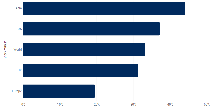 However, the UK stock market has lagged the rest of the world. Since the Brexit vote, Asian shares have returned 44.1%, according to Thomson Reuters data; US stocks returned 37.2%. Only European shares, of the five main indices we looked at, made less than the UK, returning 19.5%. Global stock markets have returned 33.2%.
