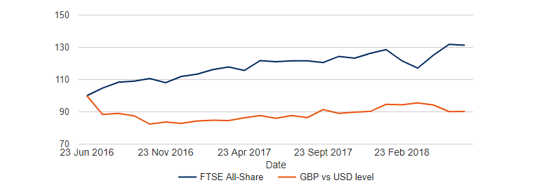 In the immediate aftermath of the referendum the FTSE 100 and the FTSE 250 fell 9% and 12%, respectively. But since the close of the market on 23 June 2016, UK shares, as measured by the FTSE All-Share, have risen 31.2% as of 15 June 2018.