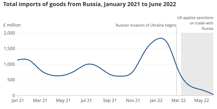 All imports from Russia also fell to £33m in June, the lowest level since records began in January 1997, the ONS said.