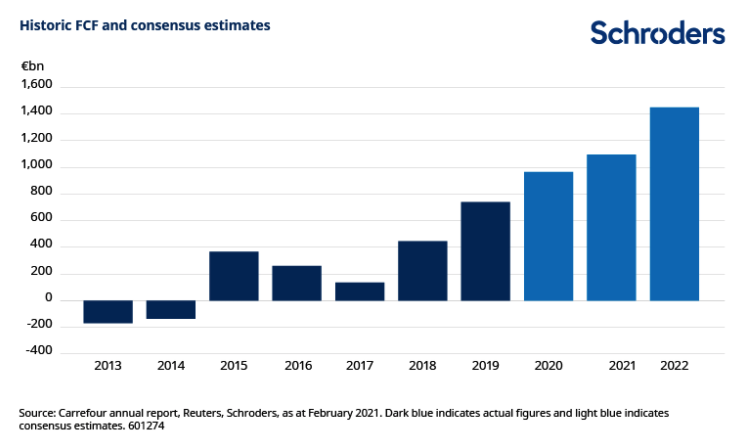 The chart below shows how Carrefour’s FCF began to improve in 2018, with consensus estimates anticipating further improvements in 2020 and beyond.