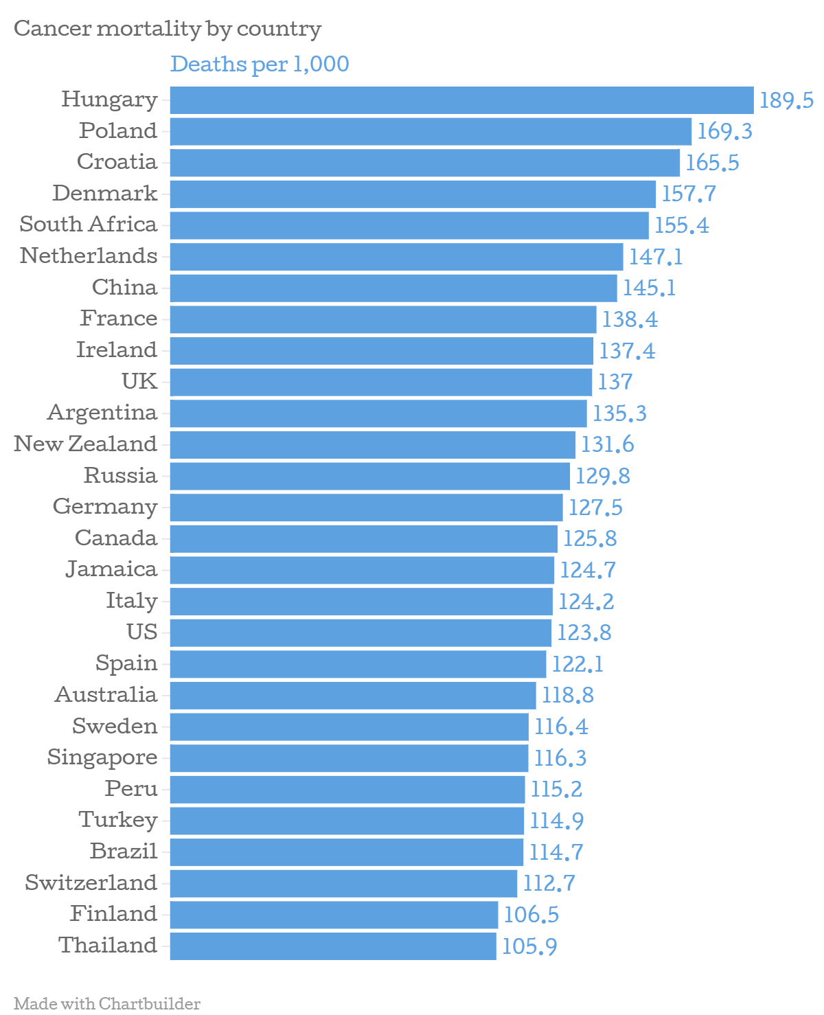 According to the most recent figures from the World Health Organisation (WHO), 137 out of 100,000 people die from cancer each year in the UK, which is more than in most countries in Europe and beyond.