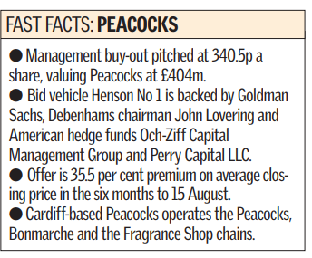The Peacocks management team, backed by Goldman Sachs, Debenhams chairman John Lovering and American hedge funds Och-Ziff Capital Management Group and Perry Capital LLC, emerged yesterday with a 340.5p a share bid for the 843-store group.