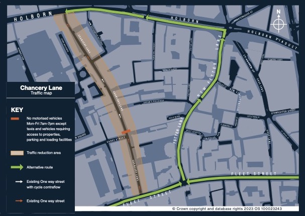 During the experiment, the one-way northbound restriction in Chancery Lane will stay in place, with cars able to use Fetter Lane to travel between Fleet Street and High Holborn.