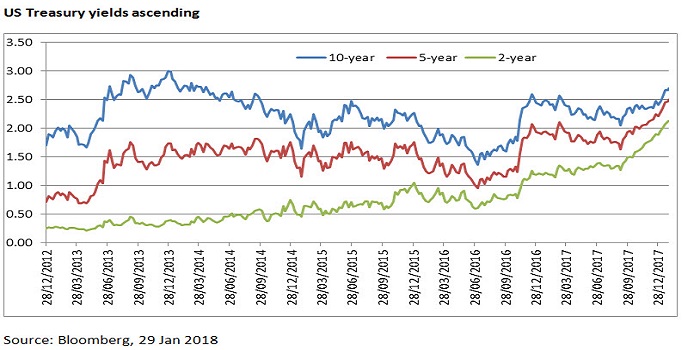 Prior to January’s developments, the Treasuries curve had undergone a significant flattening, towards the end of 2017. In other words, the difference in yields on bonds of shorter and longer-dated maturities fell, and quite markedly. Two-year yields increased from 1.48% to 1.89% over the final three months of last year.