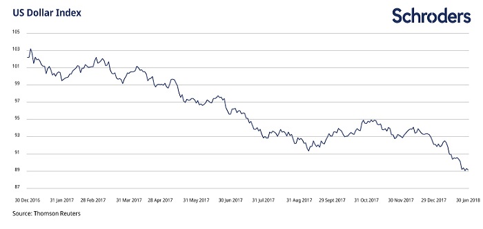 The US dollar index, which measures the dollar’s strength against a basket of six other major currencies, lost around 9.1% in 2017. Having seen some stabilisation in the fourth quarter, it has resumed this weakening trend in January 2018.