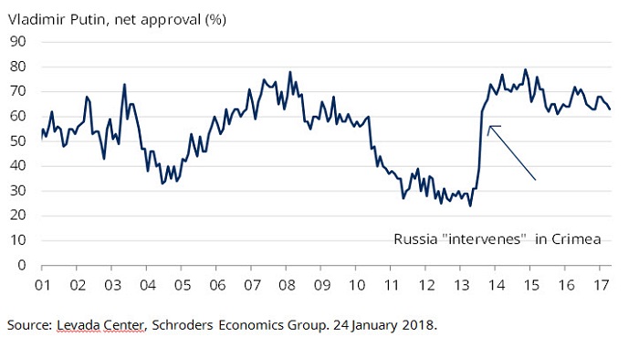 In the latest Schroders Economic and Strategy Viewpoint, Craig highlighted the chart below, which shows that Vladimir Putin is not impervious to swings in public opinion.