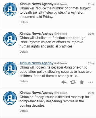 Here are the initial tweets from Xinhua early today:
