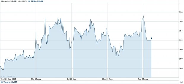 Shares in Cineworld have fallen nearly three per cent – but not enough to offset gains resulting from soaring profits in its first half report.