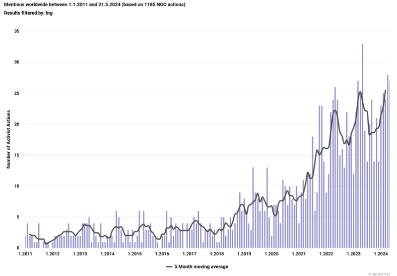 Activist campaigns targeting LNG have grown significantly in recent years, with activists calling out potential risks of transporting LNG, and associated environmental justice and climate harms. As far as targeting of the energy industry goes, it’s one of the most salient topics right now.
