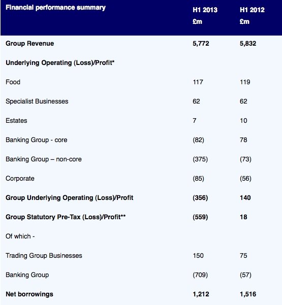 The group made £559m of pre-tax losses in the first half of the year after writing off £496m of bad loans mostly relating to Britannia Building Society, which merged with its troubled banking business in 2009.