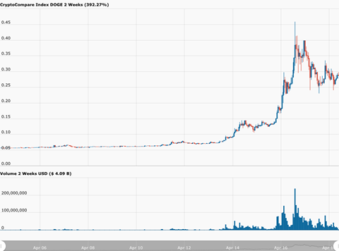 However, the altcoin that got the most attention last week was Dogecoin ($DOGE), Tesla CEO Elon Musk’s favorite cryptocurrency, which managed to set an insane new all-time high – $0.4592 – at 13:00 UTC on Friday, thereby temporarily becoming the fifth most valuable cryptoasset by market cap.
