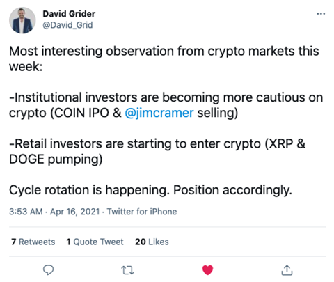 David Grider, Lead Digital Asset Strategist at Fundstrat, took to Twitter to say that he was seeing some signs of cooling of institutional investors’ interest in crypto but increasing interest from retail investors: