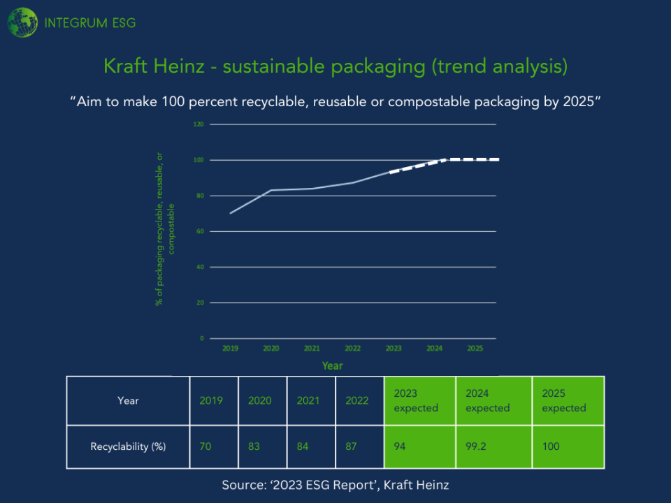 To assess Kraft Heinz’s progress toward its 2025 target, we conducted a simple trend analysis based on the last four years of data looking at the percentage of Kraft Heinz packaging that is recyclable.