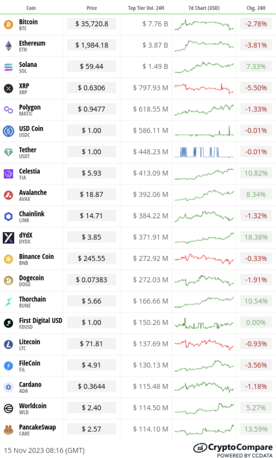 Bitcoin is down more than 3% on the day while Ethereum, in the red by 3.8%, is following the same pattern. Many other large-caps are also in the negative at the time of writing, with the exception of Avalanche, which has gained more than 8% overnight.