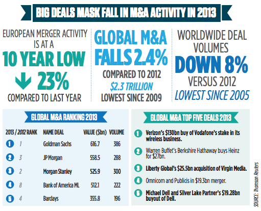 Overall dealmaking across the globe fell two per cent – propped up by a spate of US mega deals in the communications sector, including Verizon’s $130bn acquisition of Vodafone’s stake in its wireless business, which softened the fall.