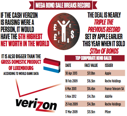 Yesterday’s bond issue was easily the largest of its kind in history, with Verizon selling almost triple Apple’s $17bn bond offering in April, which at the time was itself a record.