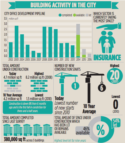 However, over three million square feet of demolition is underway as developers who shelved their schemes in the aftermath of the financial crisis return to their projects. A further 4.7m square feet is under construction in the City.