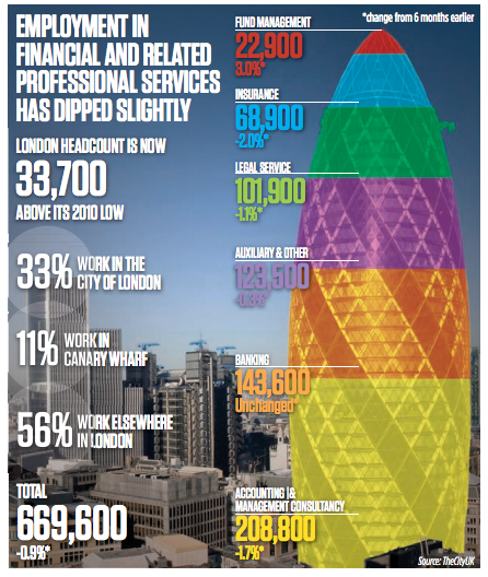 In the City and Canary Wharf, the number of financial and professional services jobs dropped by less than one per cent.